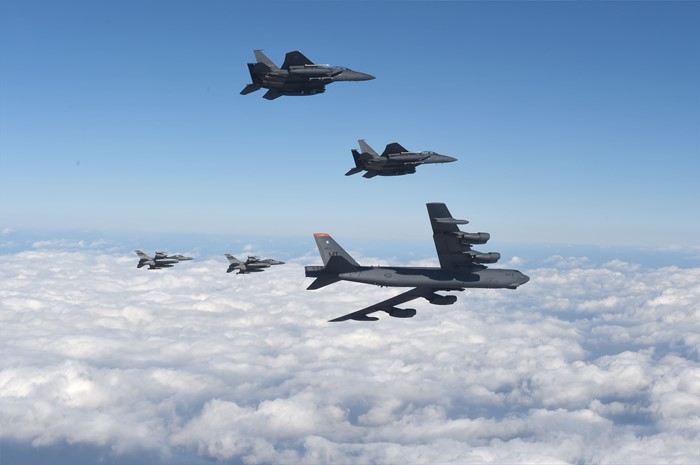 (서울=포커스뉴스) 북한의 수소폭탄 실험 이후 미국의 핵우산 제공 방침에 따라 미 공군의 전략 폭격기가 한반도로 전개한 10일 B-52 폭격기와 우리 공군의 F-15K, 미군 F-16 전투기가 한반도 상공을 날고 있다. <사진제공=공군>