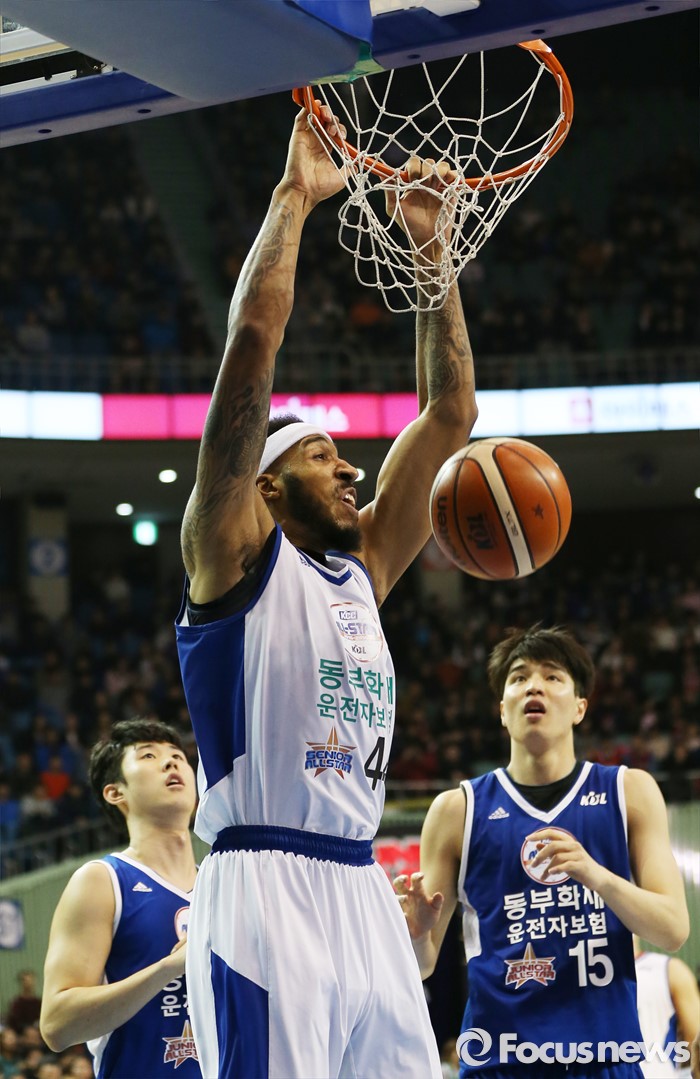 (서울=포커스뉴스) 10일 서울 잠실실내체육관에서 열린 2015-2016 프로농구 올스타전에서 시니어팀의 코트니 심스가 덩크슛을 성공시키고 있다.