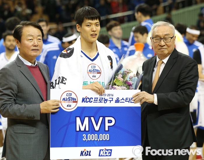 (서울=포커스뉴스) 10일 서울 잠실실내체육관에서 열린 2015-2016 프로농구 올스타전에서 MVP를 차지한 김선형(가운데)이 김영기(왼쪽) KBL 총재와 한선교 의원과 기념촬영을 하고 있다.