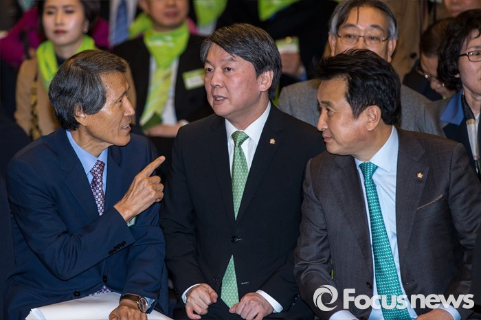 (서울=포커스뉴스) 안철수(가운데) 국민의당 의원과 한상진(왼쪽) 국민의당 창당준비위원회 공동위원장, 김영환 의원이 10일 오후 서울 종로구 세종문화회관 세종홀에서 열린 '국민의당 창당발기인대회'에 자리해 대화를 나누고 있다.