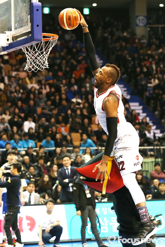 (서울=포커스뉴스) 10일 서울 잠실실내체육관에서 열린 2015-2016 프로농구 올스타전 덩크 컨테스트에서 우승한 블레이클리가 마스코트를 앞에 세워 놓고 원핸드 덩크를 성공시키고 있다.