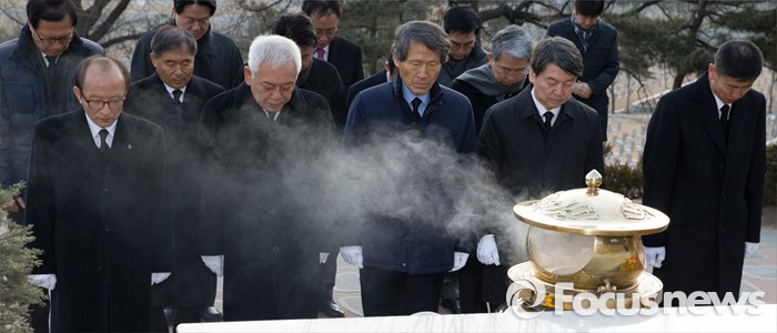 (서울=포커스뉴스) '국민의당' 창당을 추진하는 안철수(오른쪽 두번째부터) 의원, 한상진 국민의당 공동창당준비위원장, 김한길 의원이 11일 오전 서울 동작구 국립서울현충원 故 김대중 전 대통령 묘역을 방문해 참배를 하고 있다.