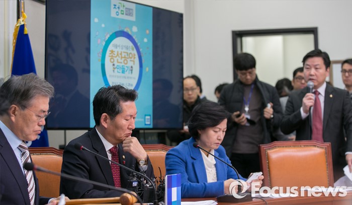 (서울=포커스뉴스) 홍종학(오른쪽 첫번째) 더불어민주당 디지털소통본부장이 11일 오전 서울 여의도 국회에서 열린 최고위원회의에 앞서 20대 총선 공약 공모 마켓인 '정감마켓' 커뮤니티를 소개하고 있다.