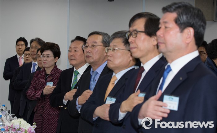 (세종=포커스뉴스) 11일 오전 세종시 정부세종청사 국토부 대회의실에서 열린 산하단체장 신년인사회에 참석한 산하단체장들이 국기에 대한 경례를 하고 있다.