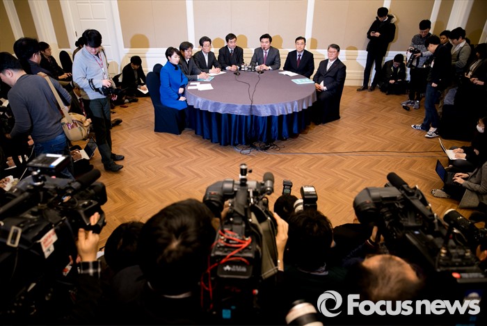 (서울=포커스뉴스) 11일 오전 서울 여의도 국회 귀빈식당에서 20대 총선 선거구 획정 기준 및 쟁점 법안 논의를 위해 진행된 여야 원내지도부 회동에 참석한 의원들이 취재진을 향해 모두발언을 하고 있다. 왼쪽부터 이언주 더불어민주당 원내대변인, 이춘석 원내수석부대표, 이목희 정책위의장, 이종걸 원내대표, 원유철 새누리당 원내대표, 김정훈 정책위의장, 조원진 원내수석부대표.