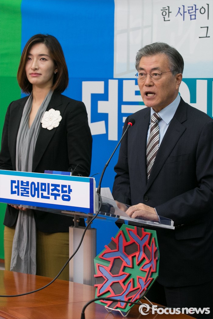 (서울=포커스뉴스) 문재인(오른쪽) 더불어민주당 대표가 11일 오후 서울 여의도 국회 당대표회의실에서 김빈(왼쪽) 디자이너의 입당 기자회견에 참석해 인사말을 하고 있다.