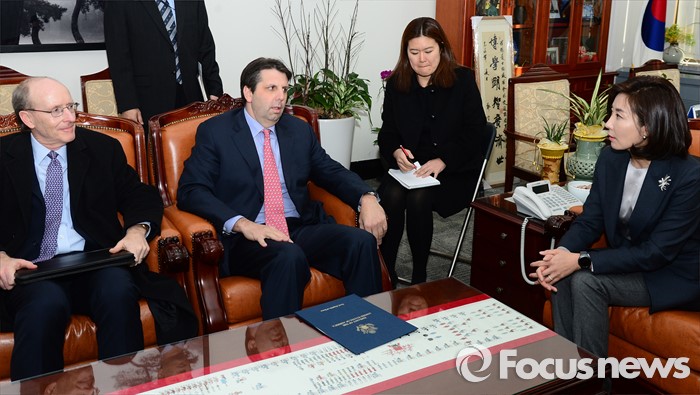 (서울=포커스뉴스) 11일 오후 서울 여의도 국회 외교통일위원회에서 열린 북한 핵실험 관련 간담회에 앞서 나경원(오른쪽) 위원장과 마크 리퍼트 주한미국대사가 대화하고 있다.