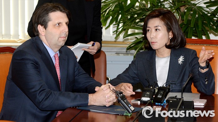 (서울=포커스뉴스) 11일 오후 서울 여의도 국회 외교통일위원회에서 열린 북한 핵실험 관련 간담회에 참석한 나경원(오른쪽) 위원장과 마크 리퍼트 주한미국대사가 대화하고 있다.