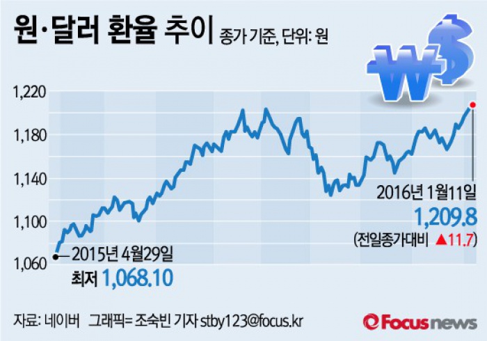 (서울=포커스뉴스) 11일 서울 외환시장에서 원·달러 환율은 전 거래일보다 11.7원 상승(원화 가치 하락)한 1209.8원으로 거래를 마쳤다