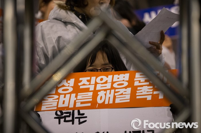 한편 삼성전자에 따르면 직업병 논란 관련 보상 절차에는 지난해 9월부터 지난달 31일까지삼성전자 반도체 사업장 및 협력업체 퇴직자 150여명이 신청했으며 최근까지 100명이에 대한 보상이 이뤄졌다.(서울=포커스뉴스) 22일 오후 서울 서초구 삼성전자 본관 앞에서 열린 '삼성의 중심에서 우리를 외치다' 행사에 참가한 삼성반도체 직업병 피해자 한혜경 씨(가운데)가 삼성 본관을 바라보고 있다. 이날 행사에서 참가자들은 삼성반도체 직업병 피해 규탄을 의미하는 방진복을 입고 삼성전자 본관을 행진했다. 2015.12.22 양지웅 기자