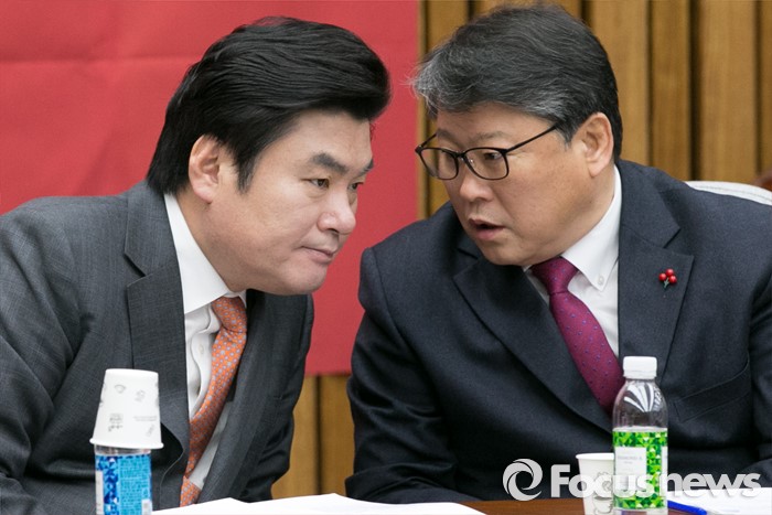 (서울=포커스뉴스) 원유철(왼쪽) 새누리당 원내대표와 조원진 원내수석부대표가 12일 오전 서울 여의도 국회에서 열린 원내대책회의에 참석해 대화하고 있다.