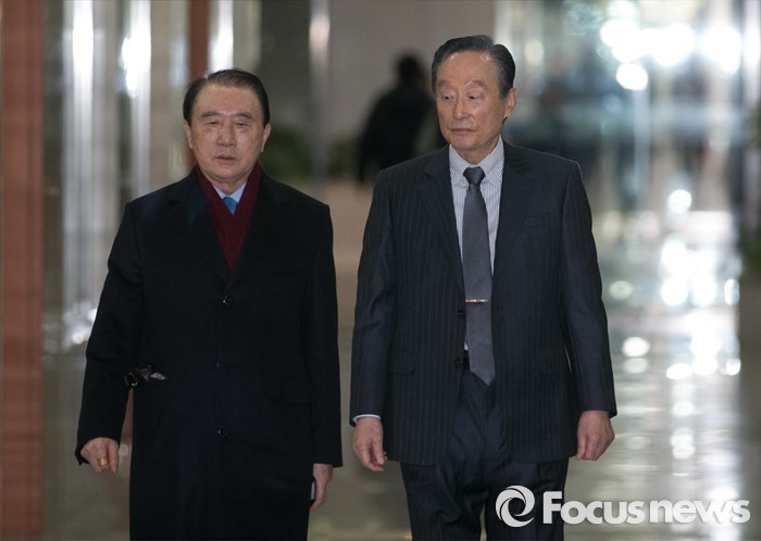 (서울=포커스뉴스) 권노갑(오른쪽) 더불어민주당 상임고문이 12일 오전 서울 여의도 국회 정론관에서 탈당 기자회견을 위해 이동하고 있다.