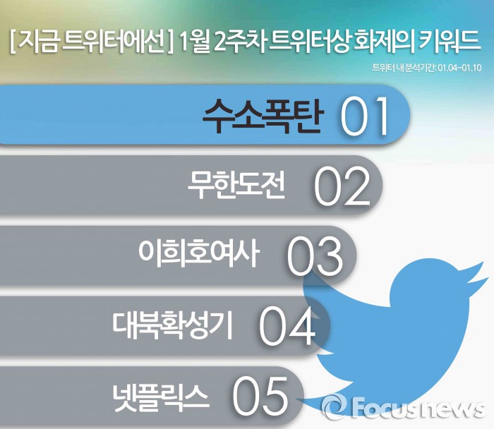 5위는 지난 7일부터 한국 서비스를 시작한 미국 동영상 스트리밍 업체 '넷플릭스'였다. 트위터 이용자들은 넷플릭스 사용 후기를 공유하며 해당 서비스에 대한 기대감을 내비쳤다.1월 2주차 트위터상 화제의 키워드 <사진제공=트위터코리아>
