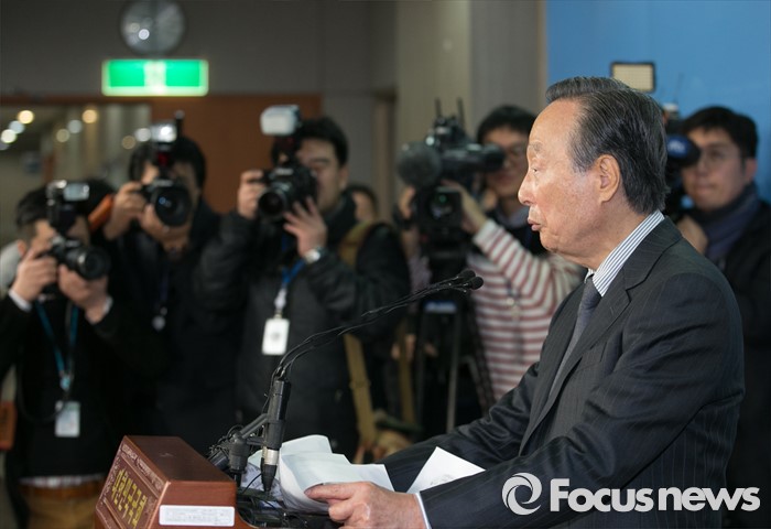 (서울=포커스뉴스) 권노갑 더불어민주당 상임고문이 12일 오전 서울 여의도 국회 정론관에서 탈당 기자회견을 하고 있다.