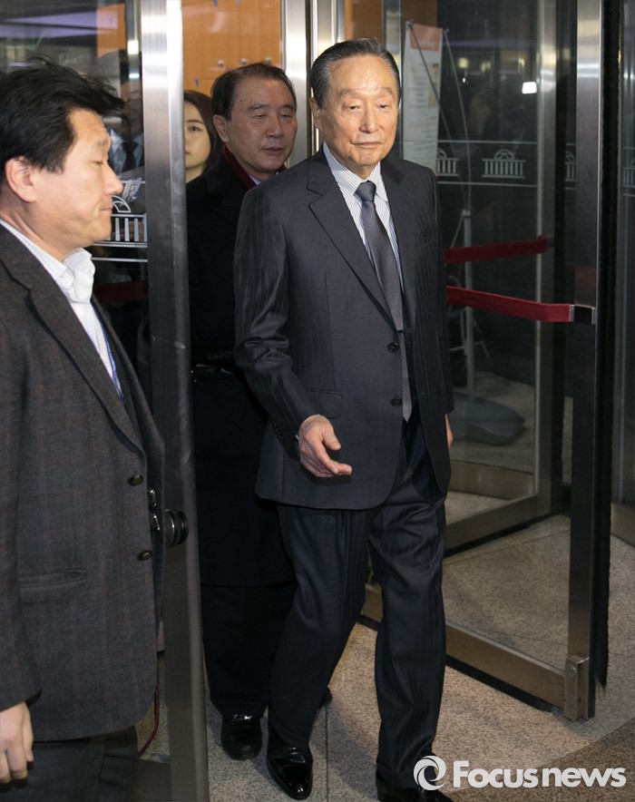 (서울=포커스뉴스) 권노갑 더불어민주당 상임고문이 12일 오전 서울 여의도 국회 정론관에서 탈당 기자회견을 마친 뒤 이동하고 있다.