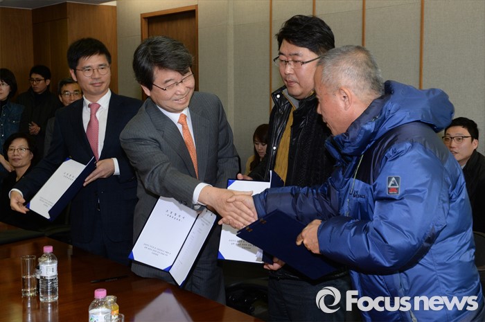 (서울=포커스뉴스) 삼성전자 반도체 사업장 백혈병 등 직업병 문제와 관련해 삼성전자와 가족대책위원회(가대위), 반올림(반도체노동자의 건강과 인권지킴이) 등 3개 교섭주체가 12일 오전 서울 서대문구 충정로 법무법인 지평에서 '재해예방대책'에 관한 최종 합의서에 서명한 뒤 악수하고 있다.