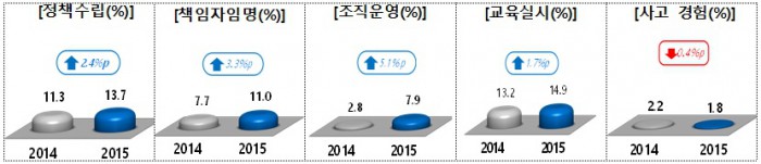 기업부문 조사결과에 따르면 정보보호 정책을 수립한 사업체는 13.7%로 전년대비 2.4%p(포인트) 증가했다. 특히 정보보호조직 운영(7.9%, 5.1%p↑)과 정보보호 최고책임자 임명(11.0%, 3.3%p↑), 교육실시(14.9%, 1.7%p↑) 등 정보보호 관련 조직 관리 수준이 전반적으로 향상됐다.