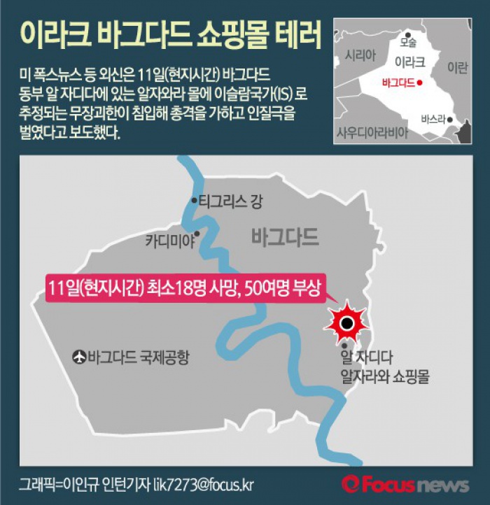 (서울=포커스뉴스) 이라크의 수도 바그다드가 연쇄 테러로 몸살을 앓고 있다. 이슬람 수니파 극단주의 무장단체 이슬람국가(IS)의 소행으로 추정되는 연쇄 테러가 곳곳에서 발생해 하루 사이에 수십 명이 목숨을 잃었다.