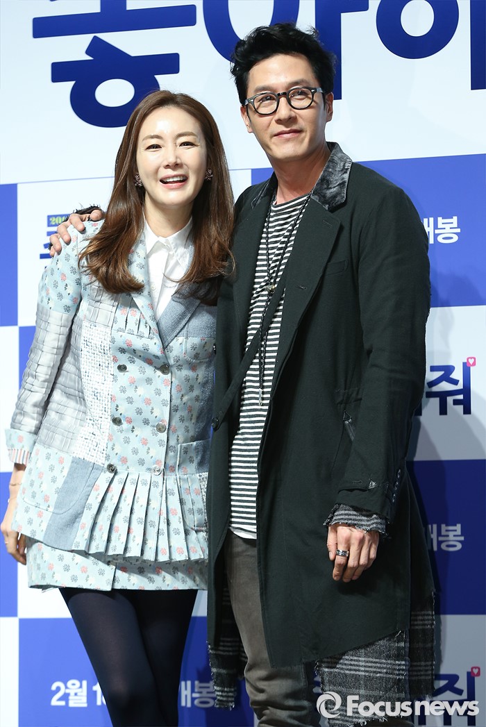 (서울=포커스뉴스) 12일 오전 서울 강남구 압구정 CGV에서 열린 영화 '좋아해줘' 제작보고회에 참석한 배우 최지우(왼쪽)와 김주혁이 포토타임을 갖고 있다.