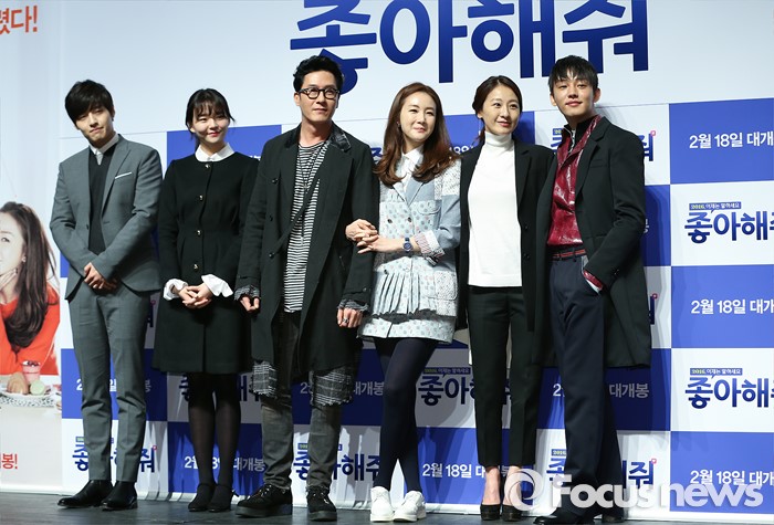 (서울=포커스뉴스) 12일 오전 서울 강남구 압구정 CGV에서 열린 영화 '좋아해줘' 제작보고회에 참석한 배우 강하늘(왼쪽부터), 이솜, 김주혁, 최지우, 이미연, 유아인이 포토타임을 갖고 있다.
