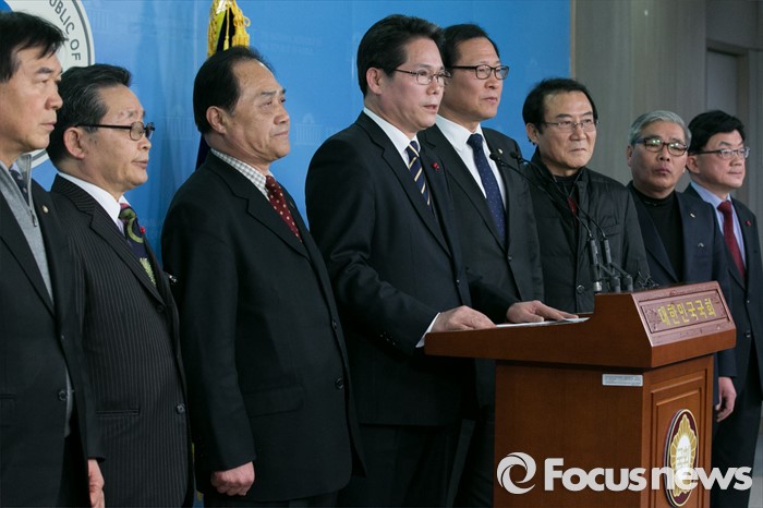 (서울=포커스뉴스) 임홍채(왼쪽 네번째) 더불어민주당 전국당원협의회 회장을 비롯한 회원들이 12일 오후 서울 여의도 국회 정론관에서 탈당 기자회견을 하고 있다.