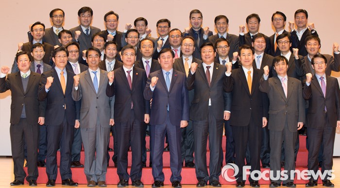 (세종=포커스뉴스) 최경환 경제부총리 겸 기획재정부장관이 12일 오후 세종시 정부세종청사 대강당에서 열린 이임식에서 기념촬영하고 있다.