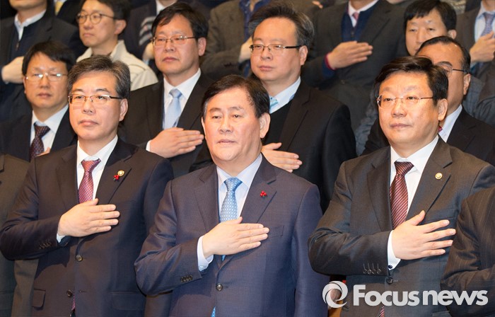 (세종=포커스뉴스) 최경환 경제부총리 겸 기획재정부장관이 12일 오후 세종시 정부세종청사 대강당에서 열린 이임식에서 국기에 대한 경례를 하고 있다.