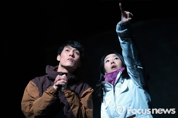 (서울=포커스뉴스) 12일 오후 서울 종로구 상명아트홀에서 열린 연극 'ALMOST MAINE(올모스트 메인)' 프레스콜에 참석한 연극배우 조풍래(왼쪽)와 김지현이 극중 별을 바라보는 장면을 시연하고 있다.