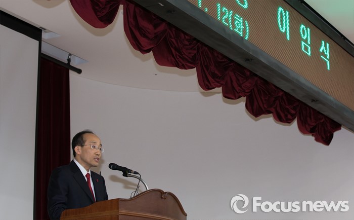(세종=포커스뉴스) 추경호 국무조정실장이 12일 오후 세종시 정부세종청사 1동 대강당에서 열린 이임식에서 이임사를 하고 있다.