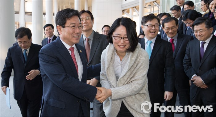 (세종=포커스뉴스) 윤상직 산업통상자원부장관이 12일 오후 세종시 정부세종청사 산업통상자원부 대강당에서 열린 이임식을 마치고 직원들과 인사하며 청사를 나서고 있다.