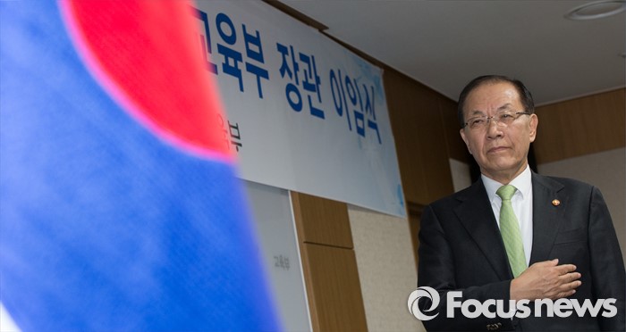 (세종=포커스뉴스) 황우여 사회부총리 겸 교육부장관이 12일 오후 세종시 정부세종청사 교육부 대회의실에서 열린 이임식에서 국기에 대한 경례를 하고 있다.