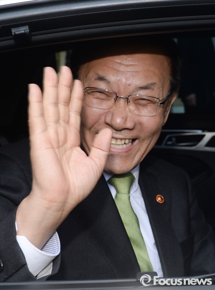 (세종=포커스뉴스) 황우여 사회부총리 겸 교육부장관이 12일 오후 세종시 정부세종청사 교육부 대회의실에서 이임식을 마치고 손인사를 하고 있다.