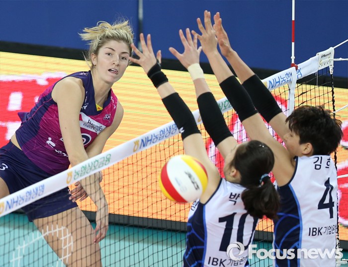 (인천=포커스뉴스) 12일 인천 계양체육관에서 열린 '2015-2016NH농협 V-리그' 여자부 흥국생명-IBK기업은행 경기에서 흥국생명 테일러가 IBK기업은행 김희진, 박정아의 블로킹을 피해 스파이크를 하고 있다.