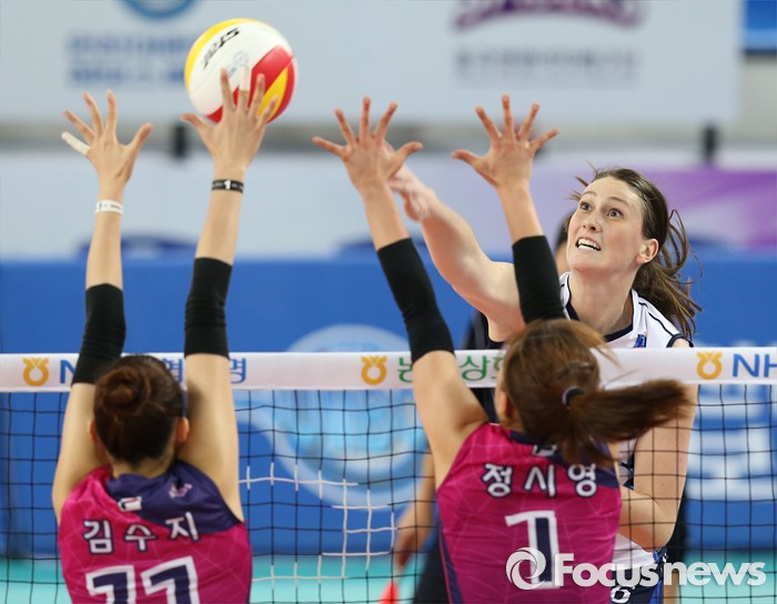(인천=포커스뉴스) 12일 인천 계양체육관에서 열린 '2015-2016NH농협 V-리그' 여자부 흥국생명-IBK기업은행 경기에서 IBK기업은행 맥마흔이 흥국생명 김수지, 정시영의 블로킹 위로 강스파이크를 날리고 있다.