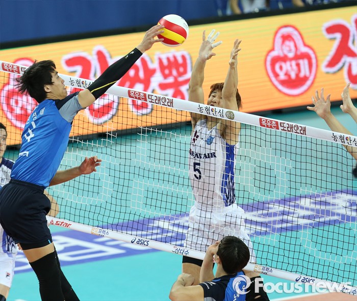 (인천=포커스뉴스) 12일 인천 계양체육관에서 열린 '2015-2016NH농협 V-리그' 남자부 대한항공-현대캐피탈 경기에서 현대캐피탈 진성태가 대한항공의 블로킹을 따돌리며 공격하고 있다.