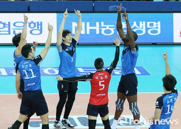 (인천=포커스뉴스) 12일 인천 계양체육관에서 열린 '2015-2016NH농협 V-리그' 남자부 대한항공-현대캐피탈 경기에서 오레올이 스파이크 서브로 마지막 득점을 올려 세트스코어 3-2로 승리한 현대캐피탈 선수들이 환호하고 있다.