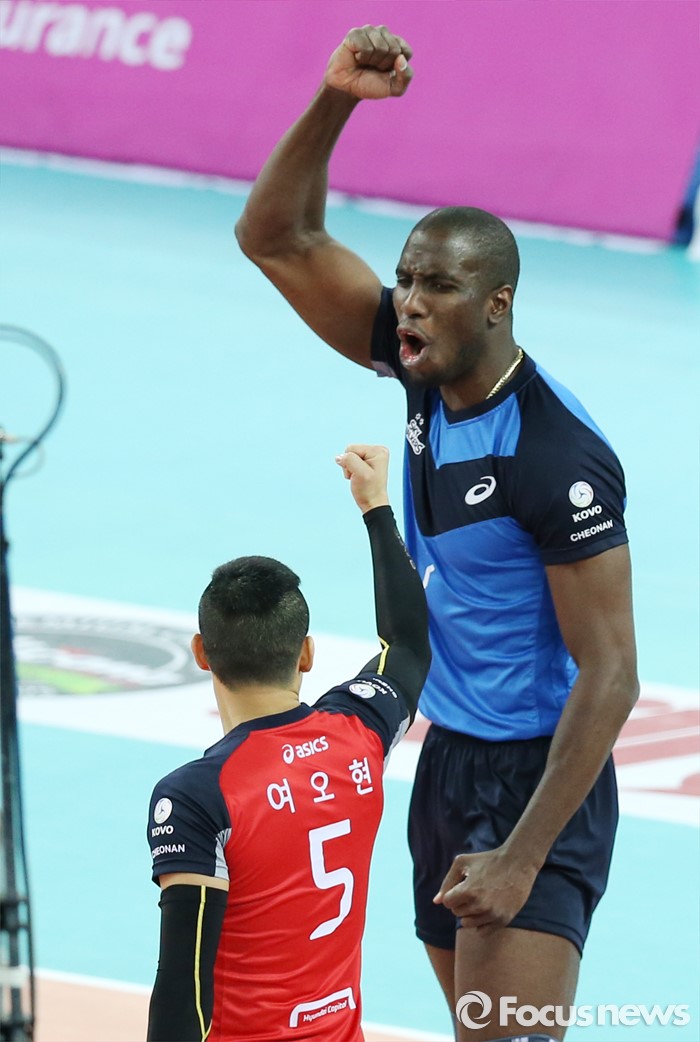 (인천=포커스뉴스) 12일 인천 계양체육관에서 열린 '2015-2016NH농협 V-리그' 남자부 대한항공-현대캐피탈 경기에서 현대캐피탈 오레올이 스파이크 서브로 득점을 올리고 환호하고 있다.