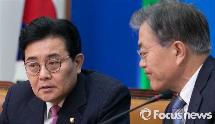 (서울=포커스뉴스) 문재인(오른쪽) 더불어민주당 대표와 전병헌 최고위원이 13일 오전 서울 여의도 국회에서 열린 최고위원회의에 참석해 대화하고 있다.