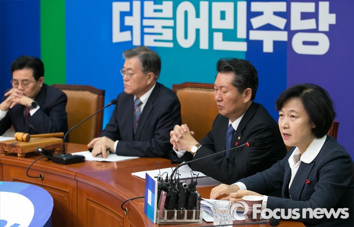 (서울=포커스뉴스) 13일 오전 서울 여의도 국회에서 열린 더불어민주당 최고위원회의에 참석한 추미애(오른쪽 첫번째) 최고위원이 권노갑 상임고문의 탈당 관련 발언하고 있다.