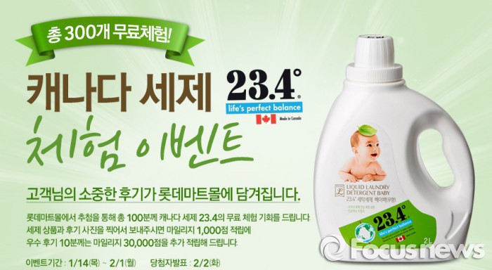 롯데마트몰은 14일부터 다음달 1일까지 캐나다 23.4°세제’ 체험 이벤트를 한다. 100명을 추첨해 캐나다 23.4°세제 제품 가운데 3가지 상품을 무료로 배송해 준다.