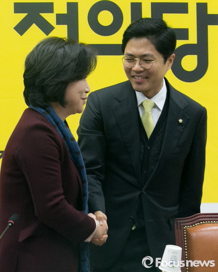 (서울=포커스뉴스) 13일 오전 서울 여의도 국회에서 열린 정의당 청년정당 비전발표회에 참석한 심상정(왼쪽) 상임대표와 김광진 더불어민주당 의원이 인사하고 있다.