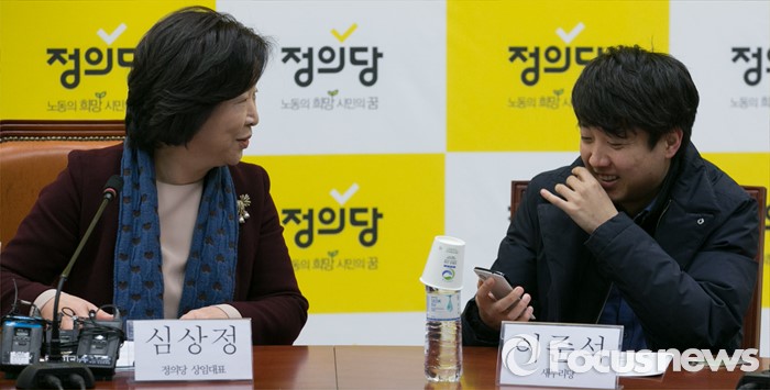 (서울=포커스뉴스) 13일 오전 서울 여의도 국회에서 열린 정의당 청년정당 비전발표회에 심상정(왼쪽) 상임대표와 이준석 새누리당 전 혁신위원장이 대화하고 있다.