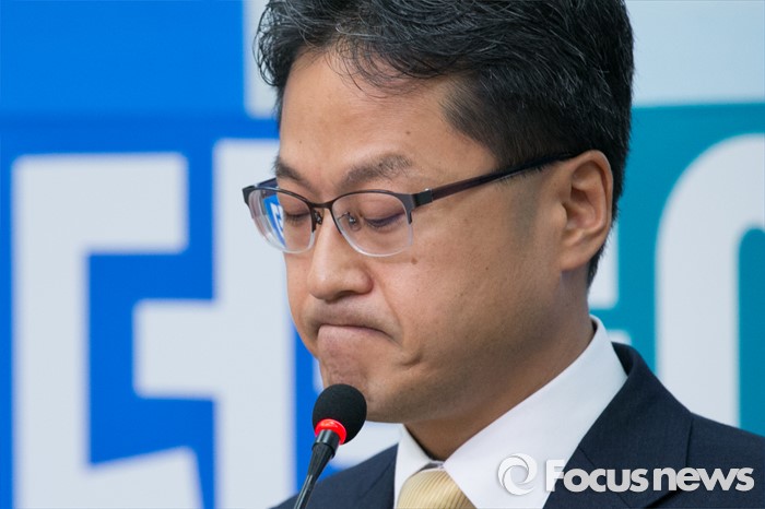 (서울=포커스뉴스) 재정부 국고국 과장을 역임한 국가재정 전문가 김정우 세종대 교수가 13일 오전 서울 여의도 국회 더불어민주당 대표회의실에서 입당 기자회견을 하며 눈물을 흘리고 있다. 김 교수의 부친은 김철배 더민주 강원도당 고문으로 12대 총선부터 15대 총선까지 5번(보선 1회 포함)을 철원, 화천, 양구 지역에서 범민주당의 이름으로 출마해, 5번 내리 낙선했다.