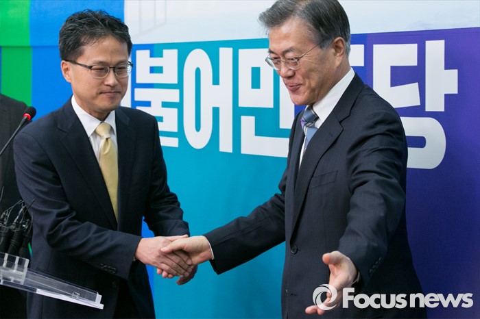 (서울=포커스뉴스) 문재인(오른쪽) 더불어민주당 대표가 13일 오전 서울 여의도 국회에서 재정부 국고국 과장을 역임한 국가재정 전문가 김정우(왼쪽) 세종대 교수의 입당식을 마치고 함께 퇴장하고 있다. 김 교수의 부친은 김철배 더민주 강원도당 고문으로 12대 총선부터 15대 총선까지 5번(보선 1회 포함)을 철원, 화천, 양구 지역에서 범민주당의 이름으로 출마해, 5번 내리 낙선했다.