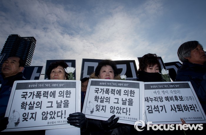 (서울=포커스뉴스) 13일 오전 서울 용산구 남일당 주차장에서 열린 '용산참사 7주기 추모주간 선포' 기자회견에 참석한 희생자의 유가족들이 진상규명과 책임을 요구하는 손팻말을 들고 있다.