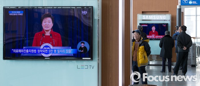 (서울=포커스뉴스) 13일 오전 서울역 대합실에서 시민들이 박근혜 대통령의 대국민 담화 및 기자회견을 시청하고 있다.