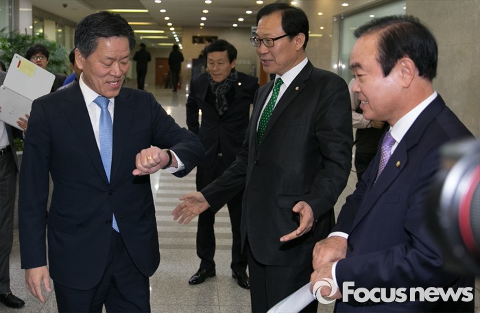 (서울=포커스뉴스) 13일 오전 서울 여의도 국회 정론관에서 장병완(오른쪽), 주승용(왼쪽) 더불어민주당 의원이 탈당 기자회견에 앞서 탈당 후 국민의당에 합류한 문병호(가운데) 의원과 인사한 뒤 이동하고 있다.