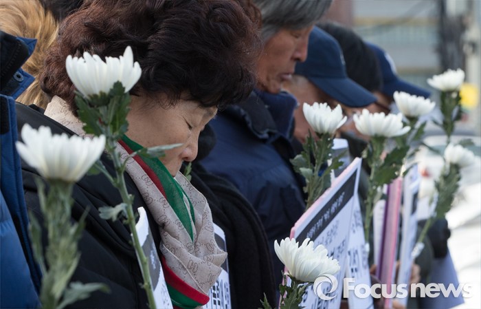 (서울=포커스뉴스) 13일 오전 서울 용산구 남일당 주차장에서 열린 '용산참사 7주기 추모주간 선포' 기자회견에 참석한 희생자의 유가족이 국화를 들고 묵념하고 있다.