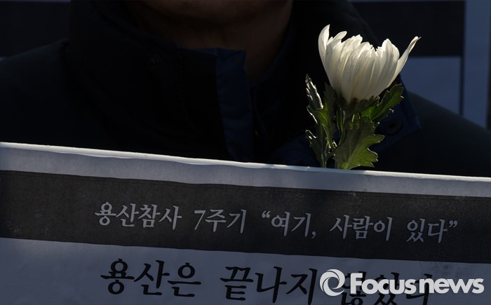 (서울=포커스뉴스) 13일 오전 서울 용산구 남일당 주차장에서 열린 '용산참사 7주기 추모주간 선포' 기자회견에 참석한 용산참사7주기 추모위원회원이 책임규명과 처벌을 요구하는 손팻말과 국화를 들고 있다.