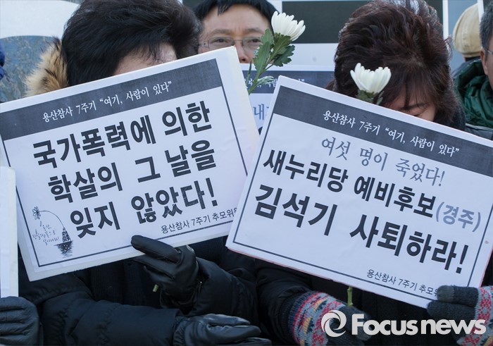 (서울=포커스뉴스) 13일 오전 서울 용산구 남일당 주차장에서 열린 '용산참사 7주기 추모주간 선포' 기자회견에 참석한 희생자의 유가족들이 진상규명과 책임을 요구하는 손팻말을 들고 있다.